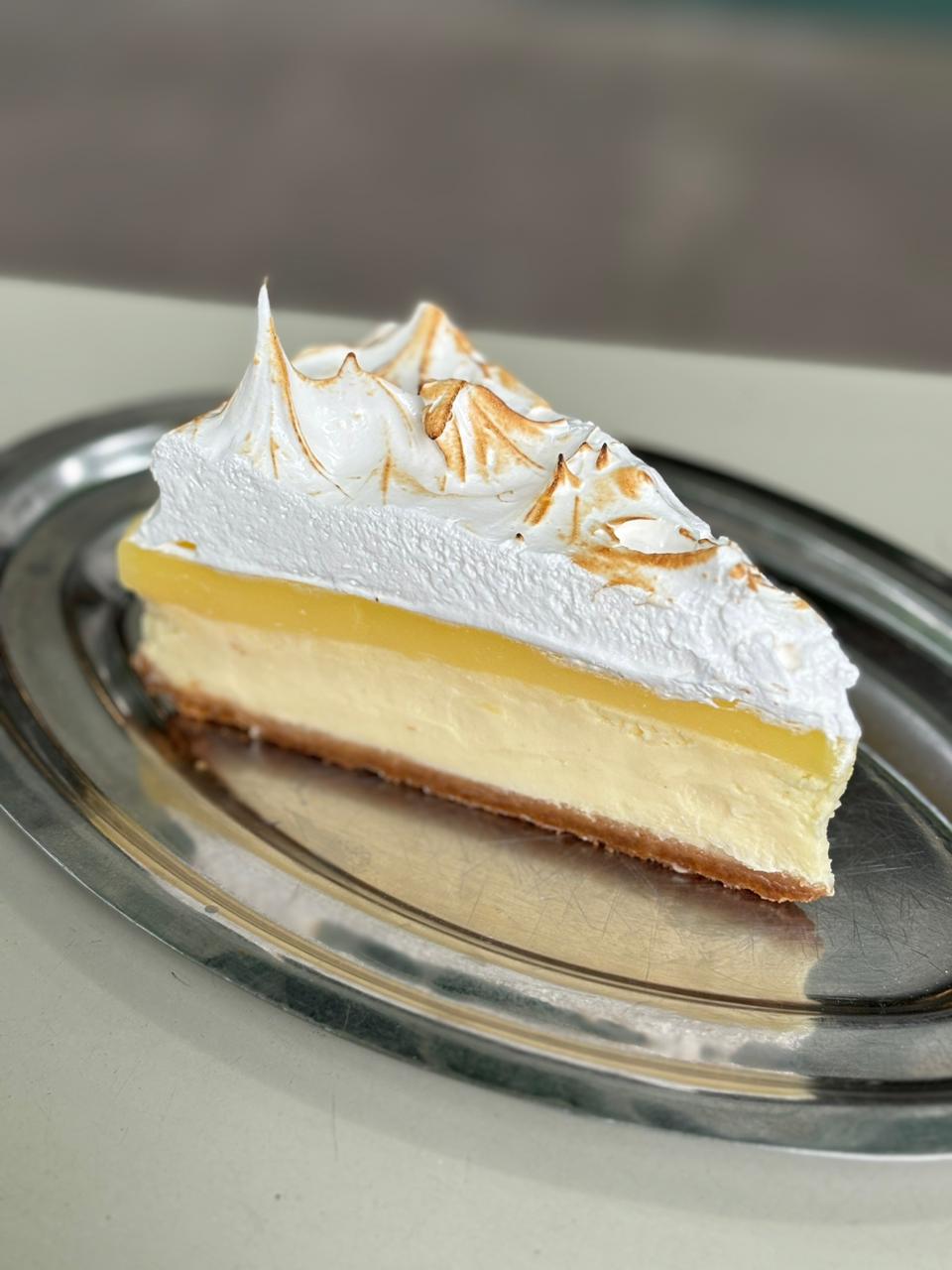Porción de cheesecake con curd de lima y merengue flameado.