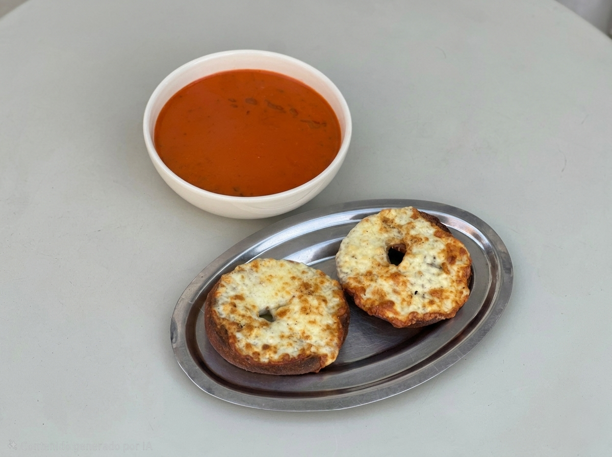 Bagel con un house blend de quesos: muzarella, danbo, pategrás y parmesano. Con un side de sopa de tomate.