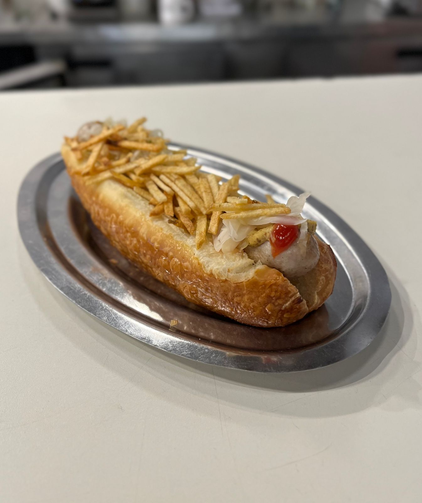 Salchicha de viena artesanal, en un pancito jalá casero.