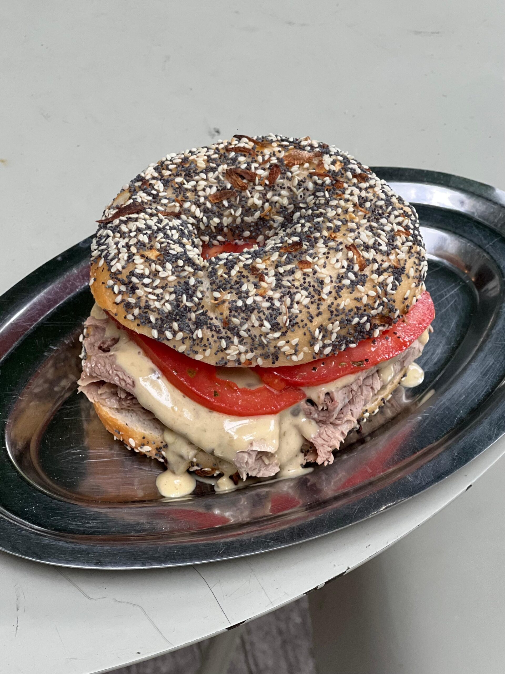 Bagel de peceto feteado con salsa tonato y tomate fresco.