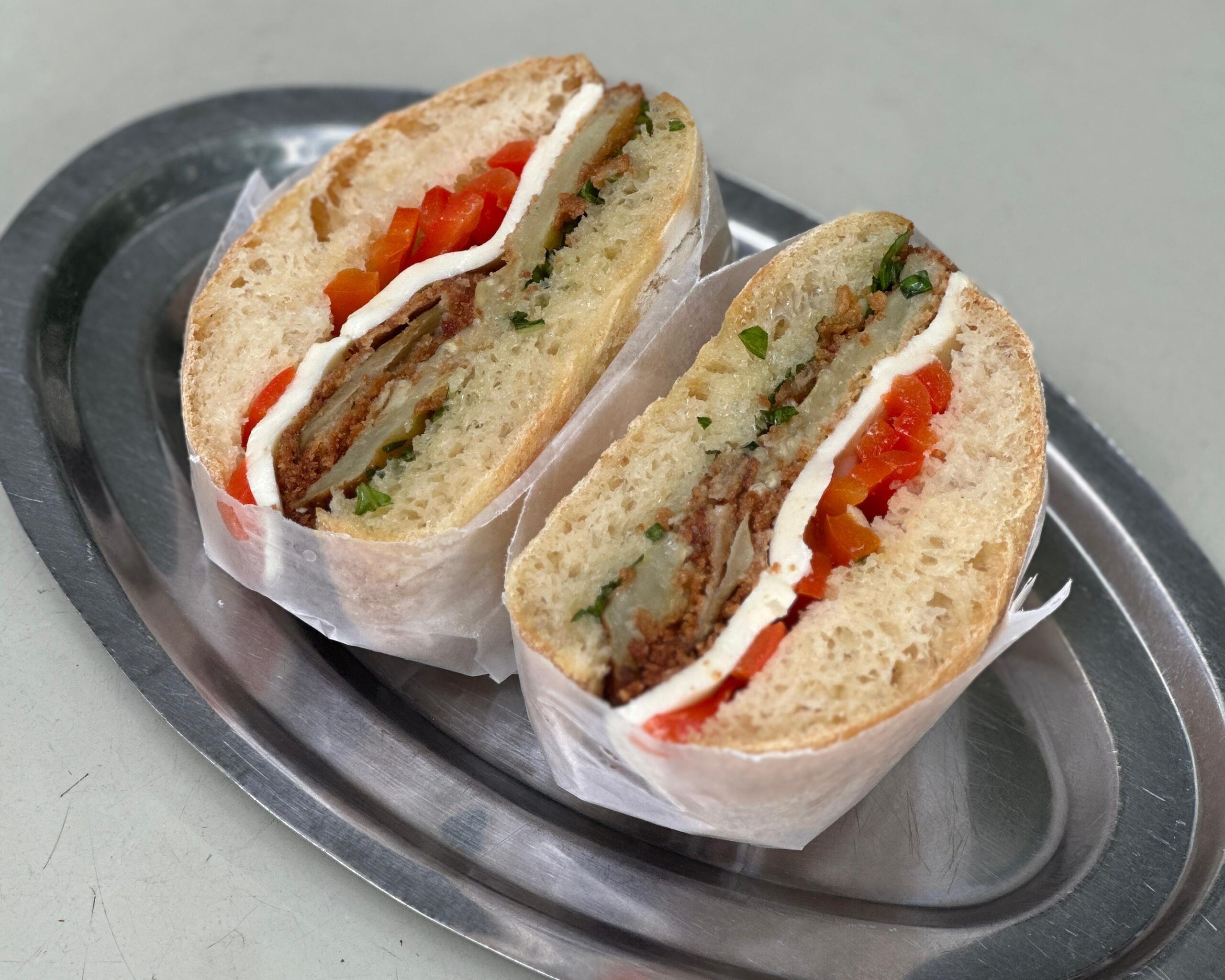 Milanesa de berenjena, muzzarella fresca, morrón en escabeche, y provenzal de ajó y albahaca, en pancito kaiser.