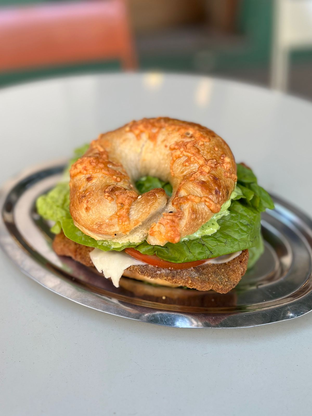 Bagel de milanesa de peceto, con mayo provenzal, lechuga, tomate y queso danbo.